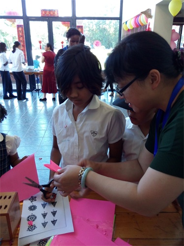 “书画体验”和“剪纸学习”两个专区同样也挤满了兴致勃勃的孩子们。大多数布校师生还都是第一次见识美妙的中国书法和有趣的剪纸艺术,不同年龄的孩子们学习热情甚是高涨。李凌院长亲临现场,挥毫为孩子们展示漂亮的中国书法,手把手亲自指导学生们如何用毛笔写下自己的中文名字、以及像“春”、“福”等这些年味十足的中国汉字,让孩子们开眼得不得了,陪同的家长也如同孩子们一般,赞叹不已。课堂刘慧老师和陈军宏老师所在剪纸专区亦是热闹非常。她们耐心地指导着孩子们,让大家亲眼见识一张张缤纷的彩纸是怎样在她们手上被三剪两剪,就变成了造型可爱的花朵、别致的“喜”字和乖萌的小娃娃的。孩子们个个瞪大了溜圆的双眼,迫不及待地跃跃欲试,虽然多数是第一次,但他们还是把各自“笨手笨脚”剪出的作品骄傲地展示给家长和朋友看,十分得意。