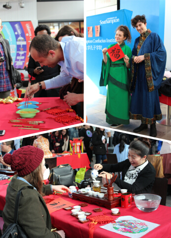 2015年2月18日,英国南安普顿大学孔子学院于除夕当日在英国南安普顿大学主校区学生活动中心举办了热闹的羊年春节庆祝活动。丰富多彩的中国文化体验活动吸引了大批本校大学生前来参与。贴春联、剪窗花、写福字、系绳结,全校师生在一片热闹祥和的气氛中愉快地度过了一个具有浓浓中国味的羊年春节。