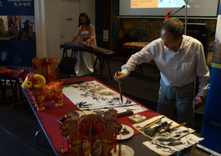 意犹未尽时,主持人为到场的来宾及学生们介绍本次羊年文化体验活动的内容。本次活动为大家准备了六个展台,分别是古筝,书法,剪纸,年画欣赏,中国传统美食,还有各种丰富多彩的游戏环节。让人们在一片欢乐祥和的气氛中感受到了喜气洋洋的中国年文化。