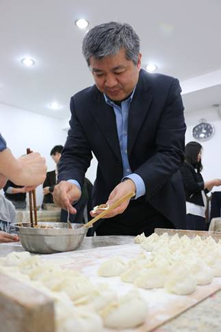 志愿者老师们早早来到大使馆,和使馆的工作人员一起准备年夜饭。有的择菜洗菜,有的做水果拼盘,有的调馅擀皮。大家来自五湖四海,包出的饺子外形也五花八门,月牙形、麦穗形、元宝形、蛤蜊形等应有尽有,这也为彼此增加了互相学习的乐趣。