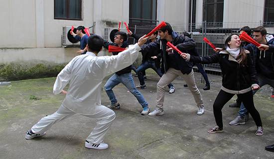 孔院首先给学生们播放了一段介绍中国新年风俗的视频,有奖问答环节,无论是关于春节习俗还是关于孔子学院的问题都难不倒孩子们,他们争先恐后地抢答,喜滋滋领走了印有罗马孔院标志的纪念品。随后,学生们分为四组进行文化体验,包括太极扇、中国结、汉语课及“美丽中国”摄影展。