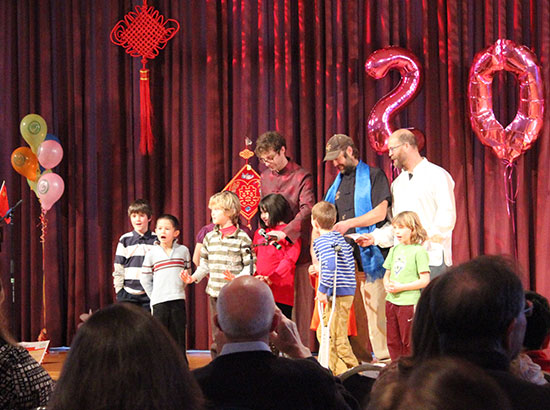 由孔子学院外方院长Suhan Chen和两位教师带来中国扇子舞表演,“太湖美啊,太湖美……”伴随着优美的乐曲,红彤彤的绸扇上下舞动翻飞,拉开本次联欢会的序幕。来自Paxson小学和Lewis & Clark小学的小朋友们重新演绎了《小星星》、《新年好》、《拍手歌》和《爸爸去哪儿?》,他们天籁般的声线,纯正的中文发音,热情的即兴表演,征服了在场所有观众。