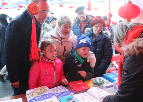 孔院印制的简洁但精美的宣传单,形象展现出孔院的汉语教学课程、教材及即将举办的各种文化活动,令观众拿到手后一目了然,许多人当场对我们的课程和文化活动表示出极大兴趣。另外我们展出的汉语教材、小辞典、汉语词汇卡等,也吸引了很多家长和小孩子,很多人当场就认读起汉字,说终于在这里找到了他们想要的汉语教材。很多人知道我们是教汉语的,纷纷来向我们请教用中文怎么说新年祝福语,一时“新年快乐”“过年好”“羊年大吉”“吉祥如意”“恭喜发财”等在我们摊位周围传播开来。我们展出的教材、汉语小词典等一度出现供不应求的现象。