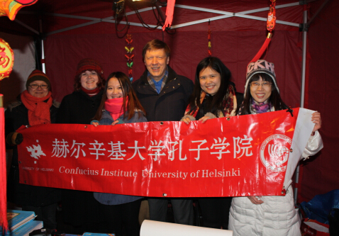 赫尔辛基大学孔子学院自 2009年开始已连续7年参加“欢乐春节”庙会。此次,孔子学院提早筹划,精心准备,努力扩大声势。第一步先是成功申请到了一个位置极佳的帐篷,并用特色的中国剪纸、醒目的中国节和大串的红灯笼精心装饰,在观众一入场时就能吸引他们的眼球。随代表团来赫尔辛基参加春节活动的北京电视台著名主持人春妮和中央电视台少儿节目主持人月亮姐姐也前来跟孔院教师合影;新闻社记者闻讯对孔子学院中外方院长进行了采访。