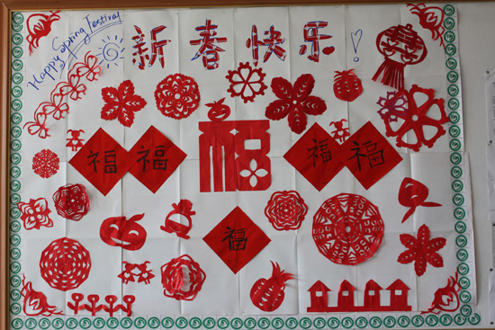 2月18日,志愿者们就用前几次活动学生的书法和剪纸作品精心装扮了孔院门口的信息栏,把中国新年的信息和欢乐传递给这里的每一个人。今天他们又以各种游戏,师生同乐,共庆佳节。
