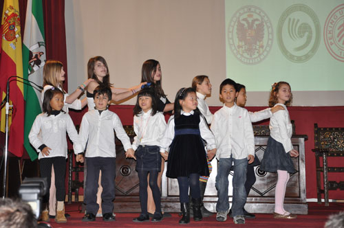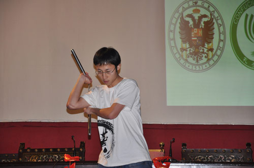 随后,由格大孔院师生为大家奉献的迎春文艺演出便拉开了序幕。孔院汉语课程中级班的一位女生用纯正的汉语为大家朗诵了孟浩然的《春晓》,随着以春为题的水墨画在舞台大屏幕上一幅幅闪过,所有在场的来宾都感受到扑面而来的盎然春意。接下来的节目更是丰富多彩,有格大翻译系的张正权老师表演的歌曲《马车夫》,有孔院汉语少儿班的孩子们表演的《幸福拍手歌》,有孔院志愿者李春丽表演的舞蹈《掀起你的盖头来》,还有汉语中级班学生西蒙的萨克斯演奏,精彩的表演赢得了大家一次又一次的热烈掌声。当汉语初级班的学生贝阿特丽丝(Beatriz)用汉语演唱《浏阳河2008》时,纯正的发音,对周笔畅惟妙惟肖的模仿都让大家叹服不已。而接下来的的双节棍表演更是让所有人眼前一亮,汉语初级班学生安德列斯(Andrés)的双节棍学习虽然只有短短两周时间,但一招一式已经初具习武者的风范,而作为他老师的孔院志愿者郭求达,更是将双节棍在手中舞得虎虎生风,博得台下观众的阵阵喝彩。孔院汉语中高级班学生为了准备散文《春》的朗诵,在紧张的学习之余,不仅将《春》的内容进行无数次诵读,还在老师的帮助下将《春》全文翻译成西班牙语,在晚会上为大家奉献了精彩的双语朗诵,让人们不仅领略了汉语的语言韵律之美,还了解了孔院汉语课程的教学状况,真可谓是一举两得。