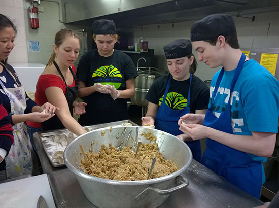6位孔子学院教师与该校学生一起发面、剁馅、擀皮、包饺子,并制作可乐鸡翅、尖椒皮蛋等中华美食。在聚餐中,王老师从饺子的由来、种类、文化内涵到吃饺子的传统,生动全面地介绍了饺子这一传统美食及中国新年的饮食风俗。