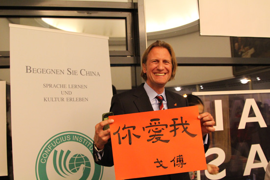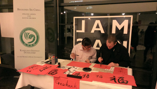 杜塞尔多夫孔子学院的老师们将笔墨纸砚带到晚会现场,既供来宾体验中国书法,也为大家当场书写福字和对联。一个晚上就有百余位来宾把“福”字带回了家。