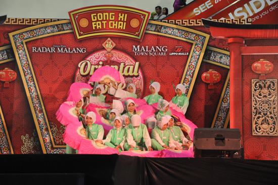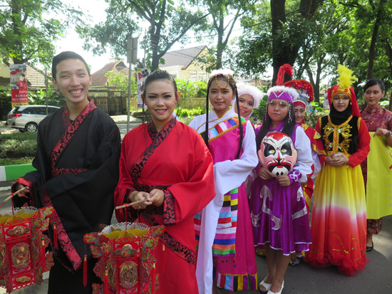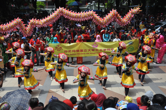 2月19日大年初一,玛琅孔院60余名师生参加了玛琅商业广场(Matos)举办的“东方之爱”贺新春活动。早晨八点半,首先举行新春游行,玛琅孔院的学生方队身着鲜艳的中国民族服饰,行进在玛琅市的大街上,吸引了大批玛琅市民驻足围观。中午时分,商厦内举办了大型文艺表演,开场节目为玛琅孔院师生的“快闪”表演,孔院院长覃小禾与一位印尼学生首先演唱了印尼民歌《梭罗河》,紧接着孔院中方教师和印尼学生组合,分别演唱了《月亮代表我的心》、《哎哟妈妈》、《恭喜恭喜》、《山歌好比春江水》、《多谢了》、《祝你平安》等中印尼民歌。在其后的表演中,玛琅孔院学生还表演了《大地飞歌》、《茉莉花》两支中国民族舞蹈,为新春活动再添上浓浓的中国色彩。