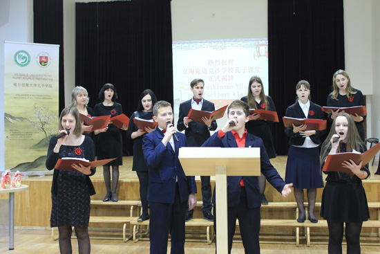 为了庆祝此次揭牌典礼,维尔纽斯大学孔子学院特邀立陶宛音乐学院的钢琴家柳劲涛先生和他在立陶宛的学生以小提琴合奏了一曲中国的经典曲目《梁祝》的“化蝶”,现场观众都听得如痴如醉;道克沙学校孔子课堂的学生们也奉上他们的学习成果,不仅现场背诵两首中国著名的诗词《元日》和《登鹳雀楼》,还送上很多中国的吉祥新春祝福语。典礼最具创意的地方,是几位道克沙学校的小歌手们共同演唱了一首中文歌曲《同一首歌》,孩子们字正腔圆,饱含感情的演唱吸引着在场观众所有的目光,这首歌,寄托着立陶宛学生们对汉语的喜爱,也表达着中立两国共唱“同一首歌”的友好情感。大家在同一首歌声中共建友谊,期盼春天,期待未来。