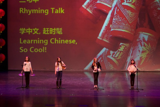布法罗大学常务校长Charles F. Zukoski致辞,给观众送去羊年祝福,并对孔子学院的工作和取得的成果表示肯定和祝贺,表示布法罗大学会进一步支持孔院的发展,并祝此次春晚联欢取得圆满成功。布法罗大国际教育事务副校长Stephen Dunnet教授为孔院教学的优秀学生颁发孔院汉语优秀奖,之后获奖的美国学生地道的用中文给观众大拜年,精彩的节目在观众的掌声中陆续登上舞台。当地学校高年级的美国学生表演了快板《洋洋洒洒过羊年》,用流利的中文为大家带来一份喜悦和祝福;美国学生合唱《明月几时有》, 在优美的旋律中让观众感受到中国文化和韵律;“三句半:学习中文大拜年”在幽默诙谐中向大家展示了汉语的独特;美国学生表演的古筝表演经典曲目《渔舟唱晚》向观众展示了中国特色乐器和音乐;幽默独创舞蹈《纤夫的爱》赢得观众阵阵笑声;布法罗交响乐团用西方乐器演奏中国特色音乐展现了中西文化的融合;当地金顶艺术团表演了中国太极;古典舞《梁祝》 以中国特色舞蹈和音乐向观众们展示了中国版的罗密欧和朱丽叶。晚会现场,观众时而安静的沉醉在音乐和舞蹈中,时而为学生流利的中文和精彩的节目鼓掌和欢呼,为中国文化陶醉,也为当地学生展现的汉语能力,文化表演能力表示惊叹。