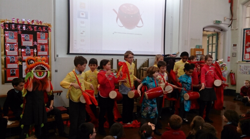 在每周四的中国文化课后兴趣班,南安孔院安排了专业的民乐老师给小学生们讲解中国传统民族乐器知识。由于学生年龄较小,老师特别精心设计了课件,让学生通过已知知识联接学习未知知识。学生们通过比较吉他和琵琶形状和琴弦数量的异同了解民乐知识,也通过欣赏中式罗密欧与朱丽叶的故事《梁山伯与祝英台》感受中式民族乐器所表现的丰富感情。在接下来的两周时间里,南安孔院的老师又为兴趣班的同学们安排学习了另一种民族打击乐器—腰鼓,腰鼓老师为学生编排了一套简单易学的动作套路,配上《开门红》的音乐,使学生们感受到腰鼓所表达的节日吉庆与丰收喜悦。