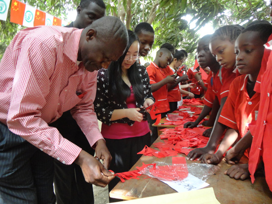 当天上午,马鲁阿分院的汉语教师一行早早就来到贝隆中学,在校园芒果林荫下拉上横幅,并精心布置了具有浓郁中国文化特色的活动展台。活动还没正式开始,大批学生们就将展台围得水泄不通,争先恐后跟汉语教师体验剪纸和毛笔书法,校长Eboh Victor及副校长也兴趣盎然在展台前驻足观看。孔院中方副院长徐永亮老师向校长解释了传统“窗花”及“春”、“囍”字等剪纸的含义后,校长也忍不住亲自体验了一番,并成功剪出一个“囍”字,在之后的致辞中他向全体师生展示了自己的作品,并借此向中国汉语教师们表达了羊年新春祝福。