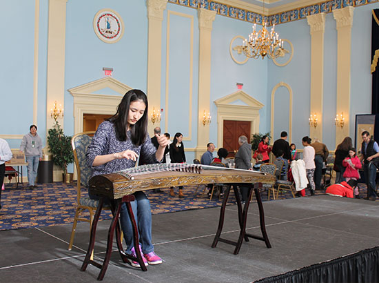 会场中央的舞台上安排了10个表演时段,分别进行二胡、琵琶、古筝、太极和咏春拳的表演。观众们不仅能够欣赏台上精彩的“文武”节目,还可以在台下近距离体验中国传统文化。