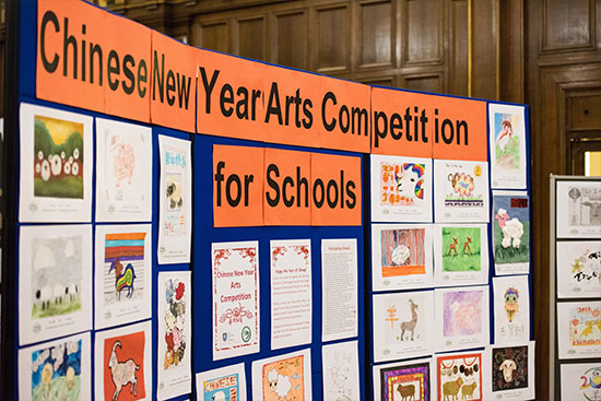 随后, 谢菲尔德市长Peter Rippon先生为在节目中表演的小朋友们发红包, 并为孔子学院举办的35校羊年生肖画比赛中的一等奖获得者颁发奖状。颁奖仪式结束后,现场观众纷纷来到四个活动区:‘用筷子’、‘写书法’、‘中国汉字连线’和‘做灯笼’。大家在各个活动区学习的不亦乐乎, 很多外国小朋友在孔院老师的帮助下顺利学会做生肖转盘和纸灯笼, 并随即将它们送给了身边的小朋友和爸爸妈妈。