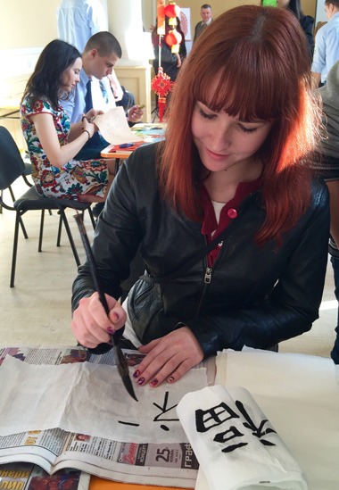 鲁塞中学十年级(高一)的丹妮特地穿上旗袍来参加游园会,学了3年中文的她,特别想让汉语教师董豪在宣纸上写下她的中文名字。董豪有求必应,为前来参加游园会的鲁塞市民纷纷写下他们的中文姓名。他还特意挑选了“福”、“家”、“爱”等有特别意义的字,一笔一划地教大家。