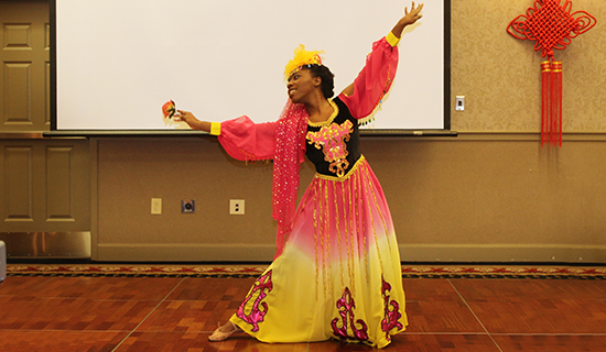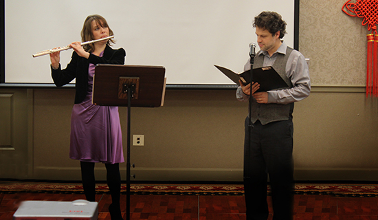 文艺演出开始后,南卡大学音乐系教授长笛演奏家Jennifer Parker-Harley和巴松管演奏家Micheal Harley夫妇为大家合奏了由该校大学音乐系教授方满创作的长笛独奏曲《四龙传说》。随后威斯理安女子学院孔院学生带来精彩的新疆舞《花开西域》和傣族舞蹈《姐妹》。