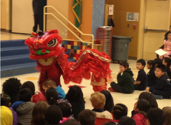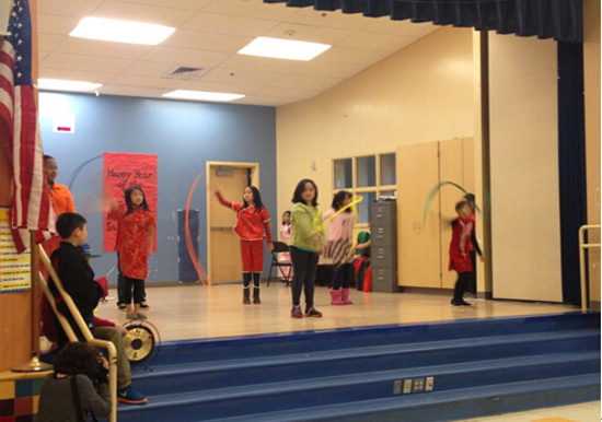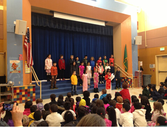 不一样的肤色,不一样的国籍,一起说着中国话,过着中国年,其乐融融、喜气洋洋,新春庆祝活动取得圆满成功。庆祝活动由舞狮表演及四、五年级中文班学生的缎带舞表演开场,紧随其后是邓校长的传统中国乐器古筝表演,她浓厚的中国文化底蕴,精湛的演出掀起了整台庆祝活动的高潮。接下来分别是一年级中文班小朋友带来的绕口令表演《四和十》,以及由华盛顿州孔子学院汉语志愿者老师参与编排的三年级中文班的儿歌《春晓》和《恭喜》,精彩纷呈的节目赢得台下观众的热烈掌声。最后,孩子们的时装走秀也赢得满堂喝彩。
