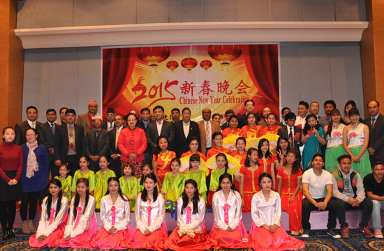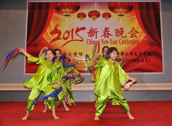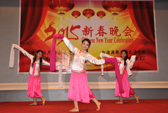 2月22日,中国驻尼泊尔大使馆与加德满都大学孔子学院联合举办2015新春晚会,本届晚会的主题为“展示教学成果,喜迎羊年新春”。中国驻尼泊尔大使吴春太阁下,文化处主任张冰先生,孔子学院理事长、加德满都大学校长施瑞斯塔教授,尼泊尔文化与考古局达哈尔局长,教育部下秘莫迪先生,尼中经贸协会主席阿努伯先生,阿尼哥协会主席塔姆先生,尼中文教协会主席哈利仕先生,移民局官员代表,孔子学院各孔子课堂及教学点学校校长,孔子学院师生等逾200人出席了晚会。