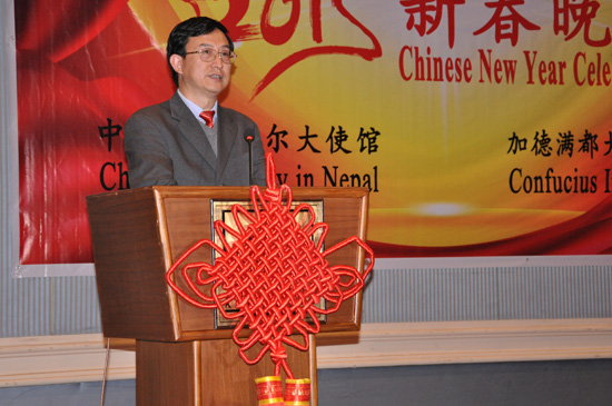 中国驻尼泊尔大使吴春太致辞,为在场观众们送上了节日的问候。他指出孔子学院创立七年来为汉语教育和中国文化的传播做出了突出贡献,并于去年开创了尼泊尔政府外交部官员和军队总部学习汉语的先河,赢得了尼泊尔社会的广泛认同和赞誉,成为尼泊尔最重要的汉语教学基地和中华文化传播机构,希望加德满都大学孔子学院在新的一年中万象更新,更上一层楼,为中尼两国友好交流合作发挥更大的作用。