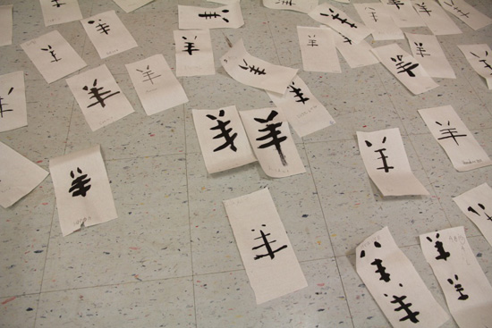 Bel Ayr小学的学生学写羊字,地上铺满了他们的待晾干的作品