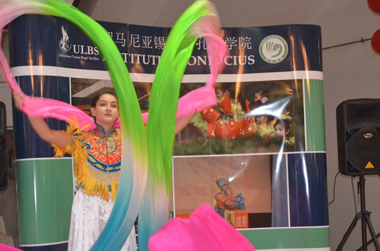 四位俊男美女的罗马尼亚主持团用流利的汉语和罗马尼亚语为现场观众讲述了中国传统元宵节的民风和习俗。随后,中外师生携手演出的集体舞《小苹果》以节奏欢快对的曲调拉开了整场演出的序幕,赢来阵阵掌声;随后,文艺气息十足的吉他弹唱,充满中国韵味的二胡伴奏舞蹈《青花瓷》,刚柔并济的太极扇等精彩节目轮番上演,引得现场观众频频喝彩。《中国民族服装秀》作为压轴节目更是让人陶醉不已,一群青春洋溢的的罗马尼亚姑娘和小伙儿穿起中国民族服装,伴着悠扬的《太湖美》乐曲从T台翩翩走来,更是把本次活动推向了新的高潮。所有节目都由锡比乌孔子学院汉语教师和汉语学习者,以及当地的中国文化爱好者亲自参演,艺术的魅力和传统的文化融为一体,为中罗文化的沟通和交流搭建起一座桥梁。