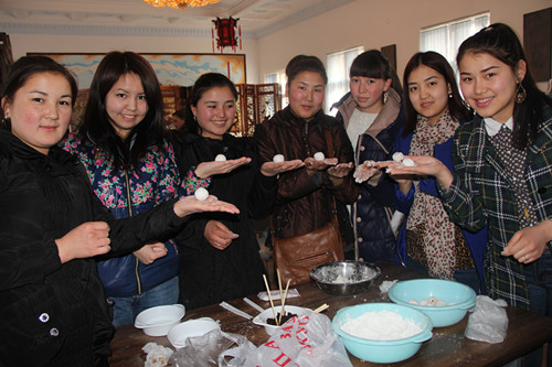 最后,活动达到高潮,孔子学院师生一同包汤圆,现场气氛热闹非凡。和汤圆粉、揉面团、放豆沙馅、搓成团、裹面粉……学生们体验着第一次包汤圆的快乐。当吃到自己包的汤圆时,学生们都兴奋地说:“汤圆真好吃!真甜!”