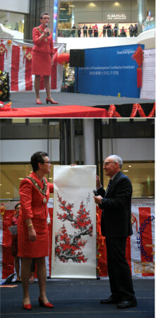 南安普顿市市长Suesan Blatchford议员为新年活动致辞并亲自为金狮点睛。她说为庆祝中国新年她也穿上寓意吉祥好运的红套装;她还用中文祝贺大家“羊年大吉,新年快乐”。南安普顿大学孔子学院院外方院长Mark Cranshaw先生为市长赠送了中国画“红梅贺春”。