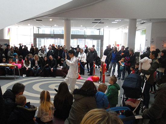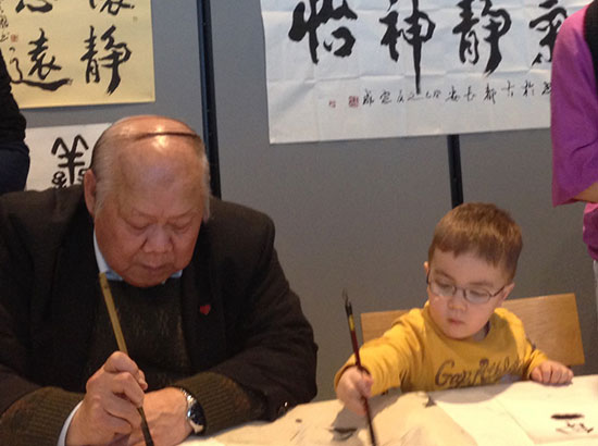 前来观看书法展览的利物浦当地华侨利用自己精通英语的优势,向参观者义务讲解展品的书体及内容含义。年逾八旬的华侨领袖廖应仁老先生兴致勃勃地参观展览,并现场挥笔写作。在他身旁,三岁的英国幼童ENZO也兴味盎然地练习书法,老少同台场面感染了在场的观众。