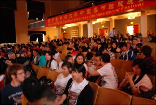 下午五点,新春招待会结束。代表们前往大学Main礼堂表演大厅,和五百名中阿肯色大学教师、各学区来访中学生、中国留学生、以及阿肯色社会各界来宾共同欣赏中阿肯色大学迎新春联欢晚会。伴着喜庆欢快的《新春乐》的乐曲,演出幕布缓缓拉开。当中阿肯色大学音乐学院教授Israel Getzov和四名中国音乐系学生出现在舞台上时,整个礼堂瞬间变了欢乐的海洋。青岛大学交流学生的古筝独奏《铁马吟》以高难度的泛音,模仿中国古建筑中庭院屋檐下随风摆舞的铃铛的音韵,让人在祥和宁静的意境中感受风月清明,享受晶莹清澈,思绪袅袅,难以忘怀。魔术《点石成金》构思精巧,手法精绝,将中国的五行说巧妙地揉入表演中,并配有中英文双语讲解使中美观众都能体会到中国魔术的奇妙。随后四名中美音乐系学生合奏了著名的莫扎特C大调弦乐四重奏和莫扎特G大调弦乐四重奏,学生们演奏技巧炉火纯青,不仅将C大调旋律的温柔恬静和G大调旋律的明澈流丽阐释得完美无瑕,而且在最有难度的合奏方面也游刃有余。在中国功夫被羡慕和欣赏的美国,中国留学生严茂元一套柔中带刚、刚劲迅猛的双截棍武术表演激起叫好声一片,表演者从单棍到双棍再到蒙住双眼使双棍,表演难度不断攀升,台下鼓掌声也愈来愈热烈。葫芦丝名曲《月光下的凤尾竹》的演奏者为中美师生描绘了月光下竹林中,清轻淡雅、令人心旷神怡的傣族风光,以及那随风漂浮的缕缕情思。钢琴独奏《黄河钢琴协奏曲》第四乐章“保卫黄河”由中国留学生窦月志精彩演绎,演奏感情酣畅淋漓、丰富饱满,充分表达出中华儿女对母亲河的爱念,以及英勇保卫母亲河的决心和信心。学生小合唱《茉莉花》在钢琴和古筝的伴奏下,采用混合演唱和轮唱这些高难度技巧,让人叹为观止;而演绎台湾民谣《丢丢》时,学生们动静结合,且歌且舞,欢快愉悦的歌声把晚会气氛再一次推向高潮。最后中阿肯色大学迎新春晚会在《难忘今宵》的歌声中结束,中美观众纷纷起立鼓掌,将他们最诚挚的祝福送给表演者,掌声经久不息。晚会后,大家向协助策划晚会的青岛大学音乐系教授祁慧民以及全体演职人员表示祝贺和感谢,希望中阿肯色大学迎新春联欢晚会明年更精彩。