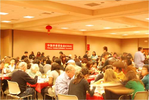 晚上七点,在装饰一新、年味浓浓的中阿肯色大学学生活动中心大厅,热闹的年夜饭正式开席,美国教师和学生与中国留学生一起兴致勃勃地品尝各式中餐美味。几十种传统的中华美食让大家应接不暇,大厅里一时人声鼎沸、热闹非凡。其间,组织方还精心地为大家准备了抽红包、猜谜语、踩气球等有趣的游戏;更令人惊喜的是中阿肯色大学的中文歌曲明星,美国学生David Teaster带来了他特别为中国新春准备的歌曲《简单爱》和《月亮代表我的心》,他自弹自唱,发音清晰地道、台风活泼稳健,掌声迭起。年夜饭活动让师生们玩得开心、惊喜连连,热热闹闹地过新年。