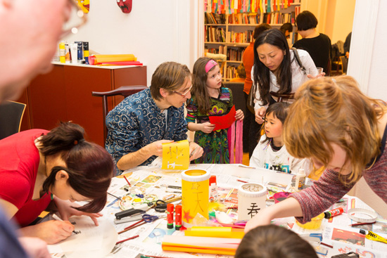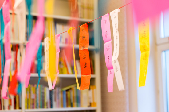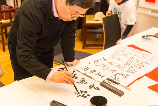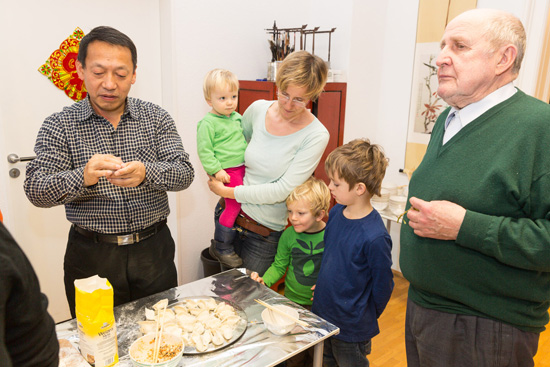当日中午1点,全院工作人员就在孔子学院院部开始布置会场,早已备齐的各种过年“道具”纷纷亮相登场:灯笼、春联、中国结、字谜等等马上就营造出浓烈的过年氛围。为了让来宾尽可能多地领略到中国过大年的风采,活动分为了几个板块:有为小朋友开辟的幼儿活动区,除各种中外玩具外,还提供各种中国幼儿读物,众多德国父母“看图识字”,像模像样地朗读讲解起来。剪纸区聘请了一位中国剪纸高手负责给各年龄段的德国人手把手地教学中国剪纸技巧, 并讲解各种图案所体现的文化诉求。很多来宾在灯笼区对制作中国灯笼表现出了浓厚兴趣,特别是在灯笼透光纸上写上祈福的各种汉字,叫他们兴趣盎然,乐此不疲。茶道区的观众在“茶博士”的讲解下,品茗论“道”。书法区请来了由莱比锡孔子学院承办的中德文双月刊“孔子学院”的书法家给来宾展示中国书法艺术,并手把手地指导跃跃欲试者“描画”中国字。字谜区的好奇者以旅居德国的华人居多,猜字的过程无疑也是亲情的温习过程,给来宾带来了莫大的精神满足。饺子区更是熙熙攘攘,许多德国人摩拳擦掌,纷纷学习饺子制作方法并加以灵活运用,于是各种形式的饺子推陈出新,引来一片叫好声。