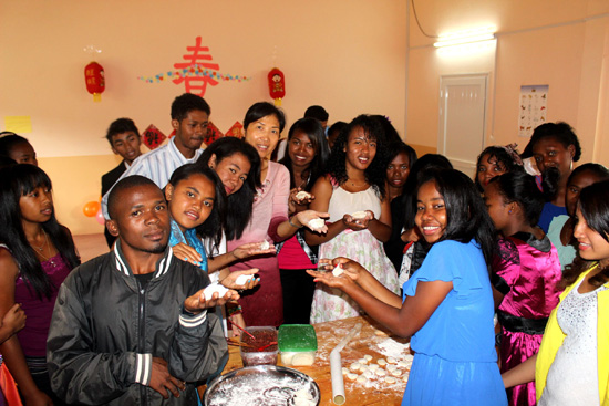 2月9日起,马达加斯加中部城市菲亚纳兰楚阿举办了为期10天的孔子学院汉语教学点春节庆祝活动,拉开了孔子学院学院春节主题系列庆祝活动的序幕。当地华侨小学400多名学生参加了为期一周的剪纸迎新春活动。法国中学的学生们在老师的带领下,以毛笔书法,制作贺卡等多样的形式一起感受中国年的味道。2月14日卡拉OK活动中,学生们除了一起唱歌跳舞还观看了中国电影《十二生肖》,吸引力很多观众前来参与。2月17日在大学汉语教学点,孔院全体师欢聚一堂,同庆春节,活动中学生们展示了经典的中国功夫和中国民族舞蹈,表演了中文歌曲及英文、法语、马语歌曲。学生们在老师的指导下学习包饺子,感受了中国的美食文化。学生们和老师一起进行联欢及做游戏。活动最后,大家一起品尝了中国美食——饺子,在热烈的气氛中迎接2015春节的到来。