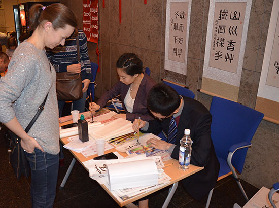 克拉科夫孔子学院教师和志愿者们精心准备了不同主题的中国文化讲座和汉语课程,和听众们分享了新年习俗、祝福语、中国食物、数字以及中医、太极等既实用又有趣的语言和知识。其中,十二生肖主题受到了极大欢迎。从“羊”字展开,再谈到羊年的象征含义,使听众无不感到新奇,慨叹中国文化的博大精深。和往年一样,书法区前排起了长龙,孔子学院教师和志愿者们用隽秀的汉字为市民书写名字和祝福语,接过“墨宝”的市民都露出兴奋的笑容。
