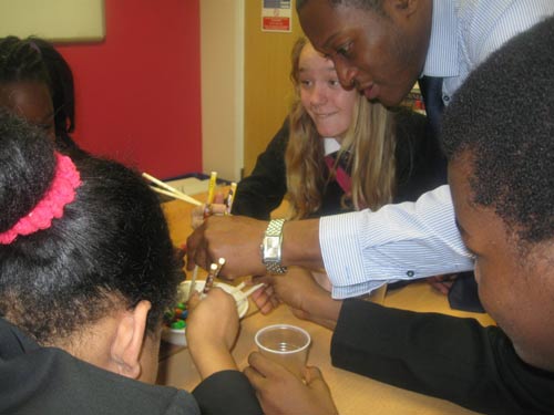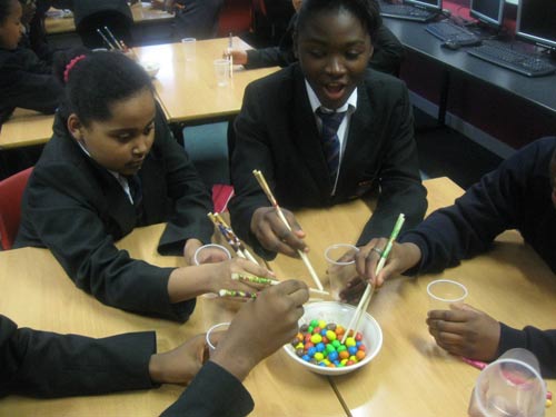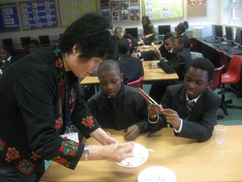 2月1日下午,英国专长孔子学院金斯福德孔子课堂的教室里与以往有所不同,学生们围坐在桌子周围,但是手中拿的不是笔和纸,而是一副副彩色的中国筷子,原来他们在进行用筷子夹糖果的比赛。