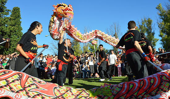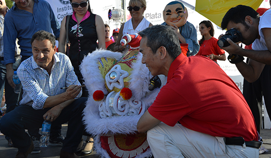 下午,Pablo市长和韩孟堂参赞为雄狮点睛,演出在欢闹的舞龙舞狮中拉开序幕。拉普拉塔各武术学校齐上阵,展示了中国现代武术、少林功夫、太极八卦掌等;华人歌手阿龙以热闹欢快的中国歌曲带动起观众们的热情;孔院学生表演的中国传统服装秀配上了简单的西班牙语介绍,大唐“贵妃”满清“皇帝”的风采使观众惊叹不已,市民们纷纷与“古代”美女合影留念。