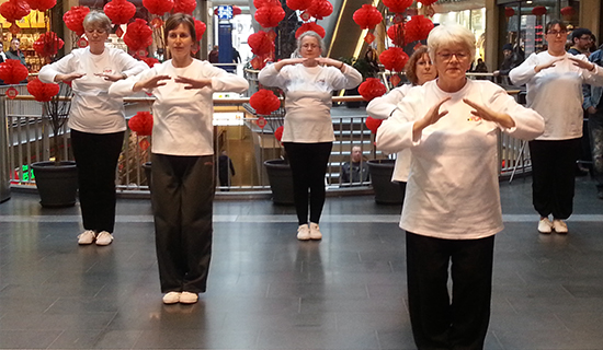 三层楼的商业长廊到处弥漫着浓浓的中国春节喜庆气氛,一层有中国传统扇子舞、花鼓舞表演,二层有比利时的中国功夫爱好者表演,吸引了大量围观人群。此外,还有中国传统服饰展览、国画展览、书法展览、雕刻展览、汉语言文化入门体验和手工制作。