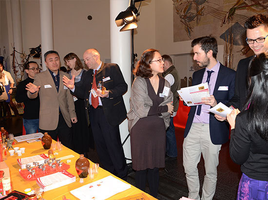 3月5日,德国慕尼黑孔子学院在巴伐利亚州中德经济论坛中举办中国白酒文化展,吸引众多来宾前来体验。
