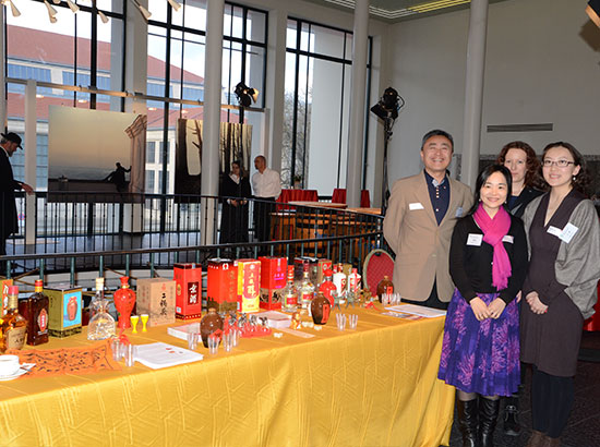 白酒展台充分融合中国新春佳节的各种元素,展出的白酒品种包括贵州茅台、五粮液、泸州老窖等品种。此外,孔子学院还准备了丰富的中国白酒文字介绍,包括白酒的历史、种类以及著名的以白酒为主题的诗词歌赋。嘉宾们一边听工作人员讲解中国白酒的历史和文化,一边品尝白酒。