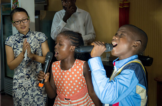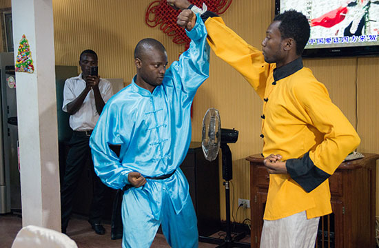 孔子学院师生精心准备了本次晚会的节目,来自杜阿拉AKWA汉语培训中心的学生演唱了歌曲《甜蜜蜜》,用甜美动人的歌声演绎了怀旧经典;由孔子学院志愿者教师和几内亚湾大学(IUG)学生分别表演的太极扇和武术套路,刚柔并济、飘逸洒脱,令人精神为之一振。