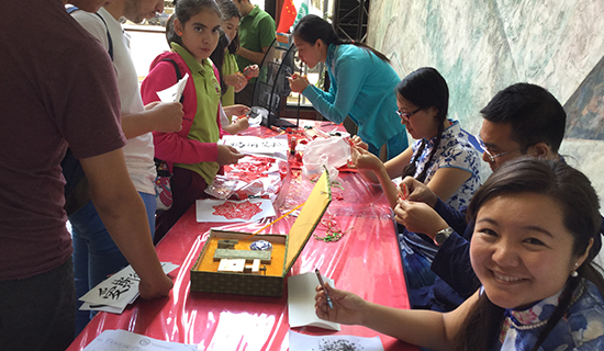 孔院准备了剪纸、书法和中国结等项目,在活动中,不仅向参与者介绍和赠送成品,而且还进行现场教学,让他们亲身体验。现场参加活动的每个人都获得了分别用汉语,韩语和日语书写的自己名字;并且学习制作了这三个国家的代表性手工艺品,如中国的剪纸和中国结、韩国的折纸莲花灯等等。