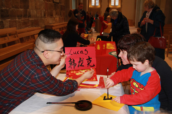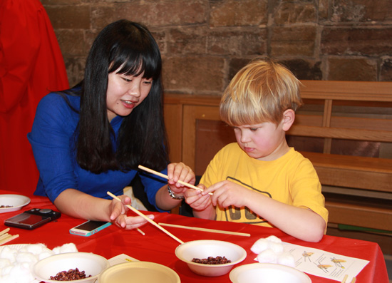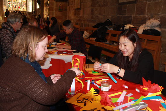 摄影展的大厅里一字排开了五个富有中国特色的活动区:中国剪纸/折纸、中国书法、汉语体验、学用中国筷子和试穿中国旗袍。每个活动区都挤满了跃跃欲试的参与者,其中一个桌子上摆放的唐装旗袍吸引了很多当地市民的目光,大家纷纷脱掉自己的外衣,穿上了中国的传统旗袍拍照留念。一位住在附近的英国老奶奶对这些旗袍赞不绝口,连连感叹中国服装的制作工艺。位于中央的书法活动区也聚集了很多人,孔子学院的书法老师独辟蹊径,给前来的外国朋友起中国名字,并将名字誊写在宣纸上,而老师落笔矜矜,清雅优美的中国毛笔字也是得到了大家的一致好评。学用中国筷子和学说中国话的体验展区也同样吸引了络绎不绝的人群,人们多以家庭为单位参与这些活动,于是经常出现父母携带孩子学用筷子,或者夫妻同台学说中国话的温馨动人的场面。
