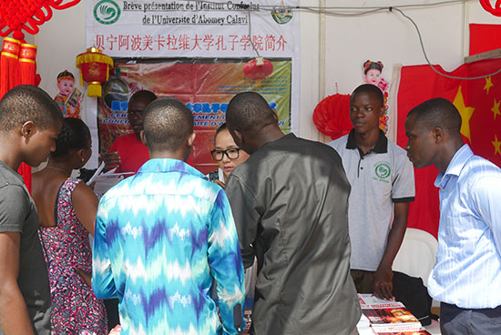 此次展览,孔子学院鲜艳的五星红旗和红红的中国结格外醒目。贝宁中国文化中心白光明参赞亲临展台指导。孔子学院主要介绍了汉语专业和兴趣班课程,HSK考试,奖学金申请等同学们关心的问题,许多学生现场登记报名参加HSK和奖学金讲座以及汉语课程培训。