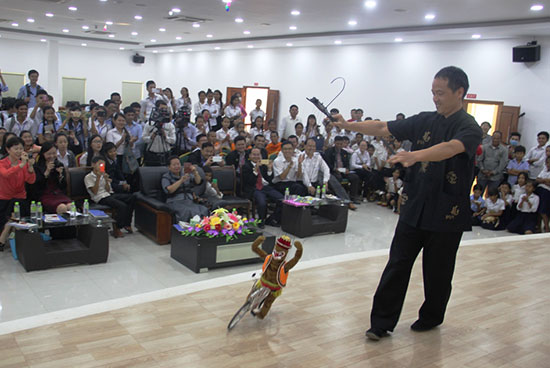 蒙可索妮表示,虽然柬埔寨与中国并不接壤,但两国之间的文化和经贸往来具有悠久的历史。柬埔寨与中国在文化艺术方面一直有着密切合作,每年在金边组织过多场文化交流活动。谢莫尼勒院长说,孔子学院在2015年春节期间举办了精彩纷呈的中国文化活动,中柬文化交流源远流长,促进了两国人民心灵的沟通和友谊的深化,在两国传统友好关系中发挥着积极作用,感谢中国福建木偶戏艺术团为孔子学院师生展演。