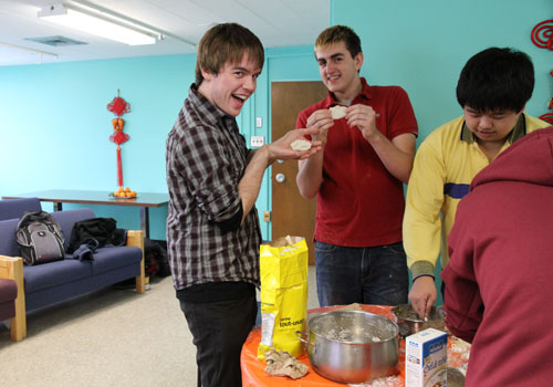 在活动开始前,已经有学生来到孔子学院热情地帮助孔院的教职工们做准备工作。大家贴春联、布置房间、和面、拌饺子馅,人人都忙得不亦乐乎。在喜气洋洋的音乐烘托下,浓浓的年味在房间中迷漫开来。