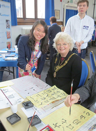 从十点半到下午两点,来体验的人络绎不绝,有伊丽莎白女王高中的学生,也有其他工作坊的工作人员,市长夫人和议员也参与进来,拿起毛笔,在宣纸上“泼墨挥毫”,他们都对奇妙的中国书法艺术赞叹不已。