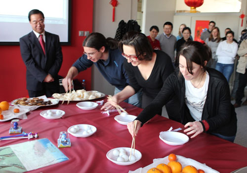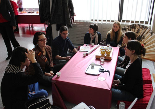 上午10点,孔子学院会议室一开门,前来参观的人们就三三两两地聚集在介绍孔子学院以及中国的图片、书籍、音乐、画册前面,交流起来。不少当地人对中国十二生肖的来龙去脉和自己的属相饶有兴致,孔子学院教师在讲解十二生肖和春节风俗之余,还特意为兔年出生的嘉宾提供了精美的小礼品。斯洛文尼亚学生主持的中国茶艺表演,也引起了当地居民的浓厚兴趣。