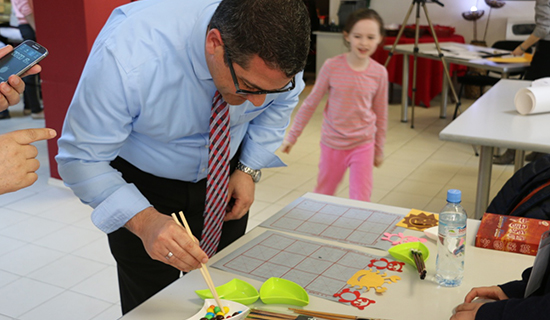 大家争先恐后地学用毛笔、筷子,竞技小游戏“筷子夹花生”更引起现场一片沸腾,校长Daniel Blaho也兴致勃勃地参与其中。此外,汉语教师们还介绍了问候语、礼貌用语及常见名词(如:北京、大熊猫、豆腐等)等相关汉语知识。