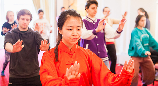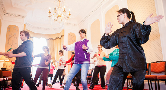 此次活动于3月16日、18日分别在孔院大楼和爱丁堡大学Easter Bush校区举行。其中的太极拳展示尤其受欢迎,首先由孔院教师简要介绍太极文化、太极拳的演变历史,以及太极拳在中国民众中广受欢迎的原因等相关文化背景;随后,伴着乐曲《高山流水》,志愿者教师刘艳丽当场演示了“陈式太极拳”。观众们迫不及待地模仿着“起式”,“金刚捣碓”和“懒扎衣”三式动作,短短的十几分钟过后,大家已将这三式打得有模有样。