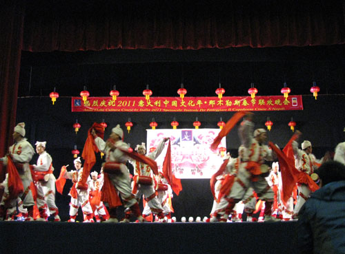2月3日下午3点,在那不勒斯皇宫广场,陕西安塞腰鼓队、广东佛山舞狮队等为当地市民展示了独具中华特色的舞龙、舞狮、腰鼓表演。112名孔子学院的学生身穿中国56个民族、共112套(男女各56套)服装,孔子课堂的数百名学生头戴中国京剧年谱、手持中意国旗、一百多名孔子课堂小学生手持汽球,在广场和舞龙、舞狮队共同翩翩起舞,吸引了数千名市民和游客围观、喝彩。